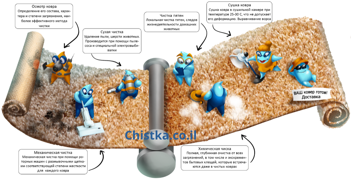 Заказать химчистку вы можете по телефону 052-7216062, через форму на сайте или отправив фото изделия в WhatsApp. Для чистки мебели и матрасов на дому необходимо обеспечить доступ мастеру в оговорённое время, однако ваше постоянное присутствие во время работ не обязательно. Для вывоза ковров на фабрику достаточно быть дома во время передачи и приёмки ковра.
