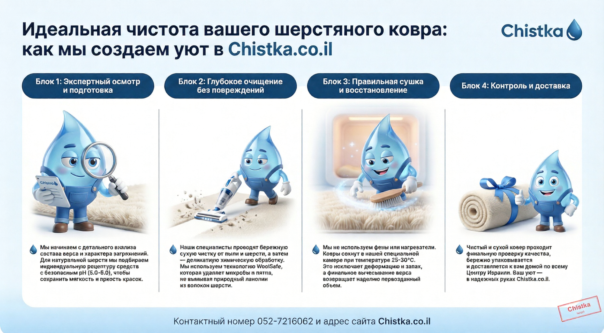 Чтобы не ошибиться с выбором средств и технологии очистки шерстяного ковра, лучше довериться профессионалам. Специалисты компании «Чистка» подберут безопасные составы, очистят ковёр на фабрике в Петах‑Тикве или на дому и проведут химчистку без риска для структуры и цвета натуральной шерсти.