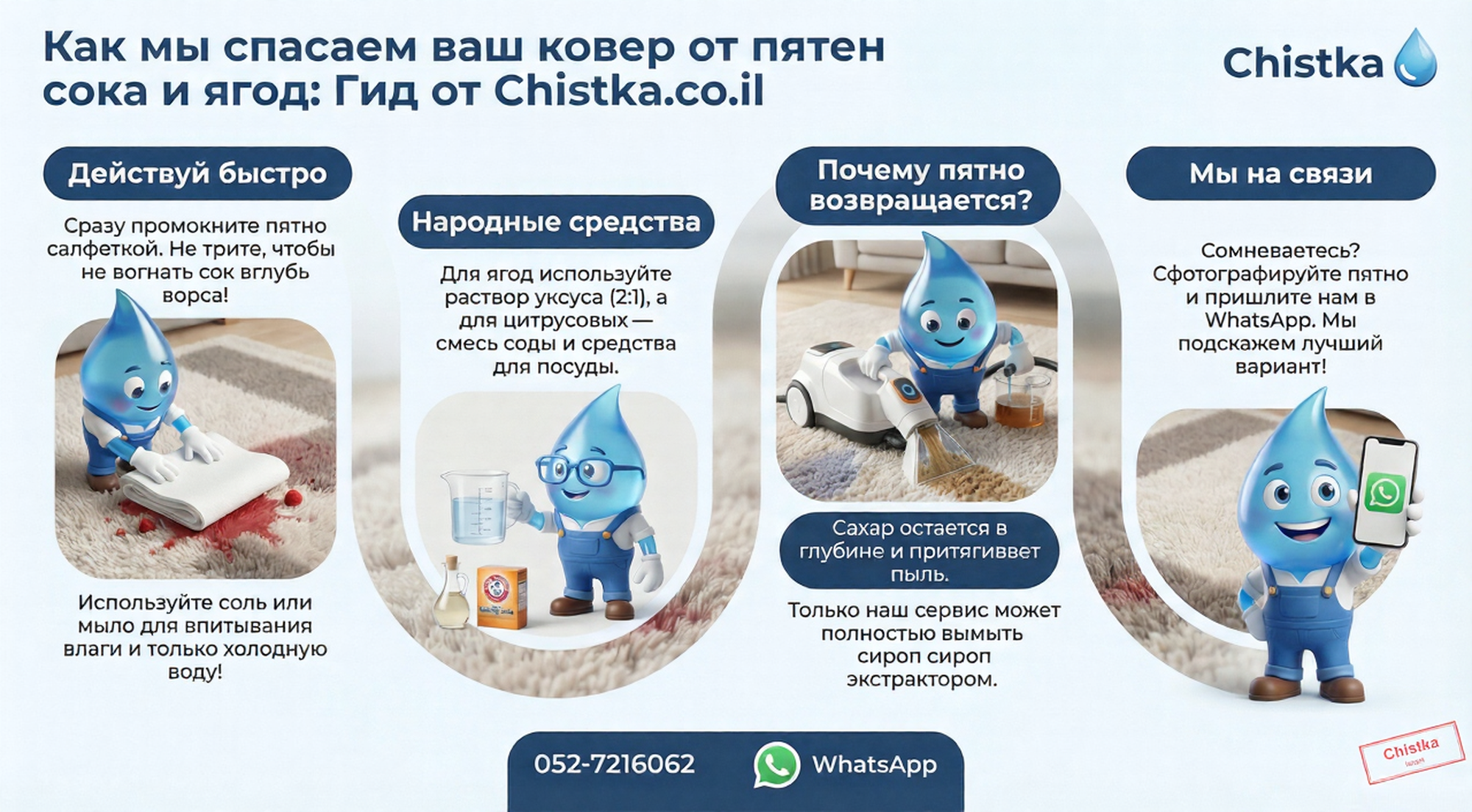 Если вы не сразу заметили пятно или сомневаетесь, как лучше его удалить без вреда для ковра, можете обратиться к нам. Мы оперативно и качественно проведём химчистку ковра в вашем доме или на фабрике в Петах‑Тикве, подберём безопасные средства и вернём ковру максимально возможный внешний вид.