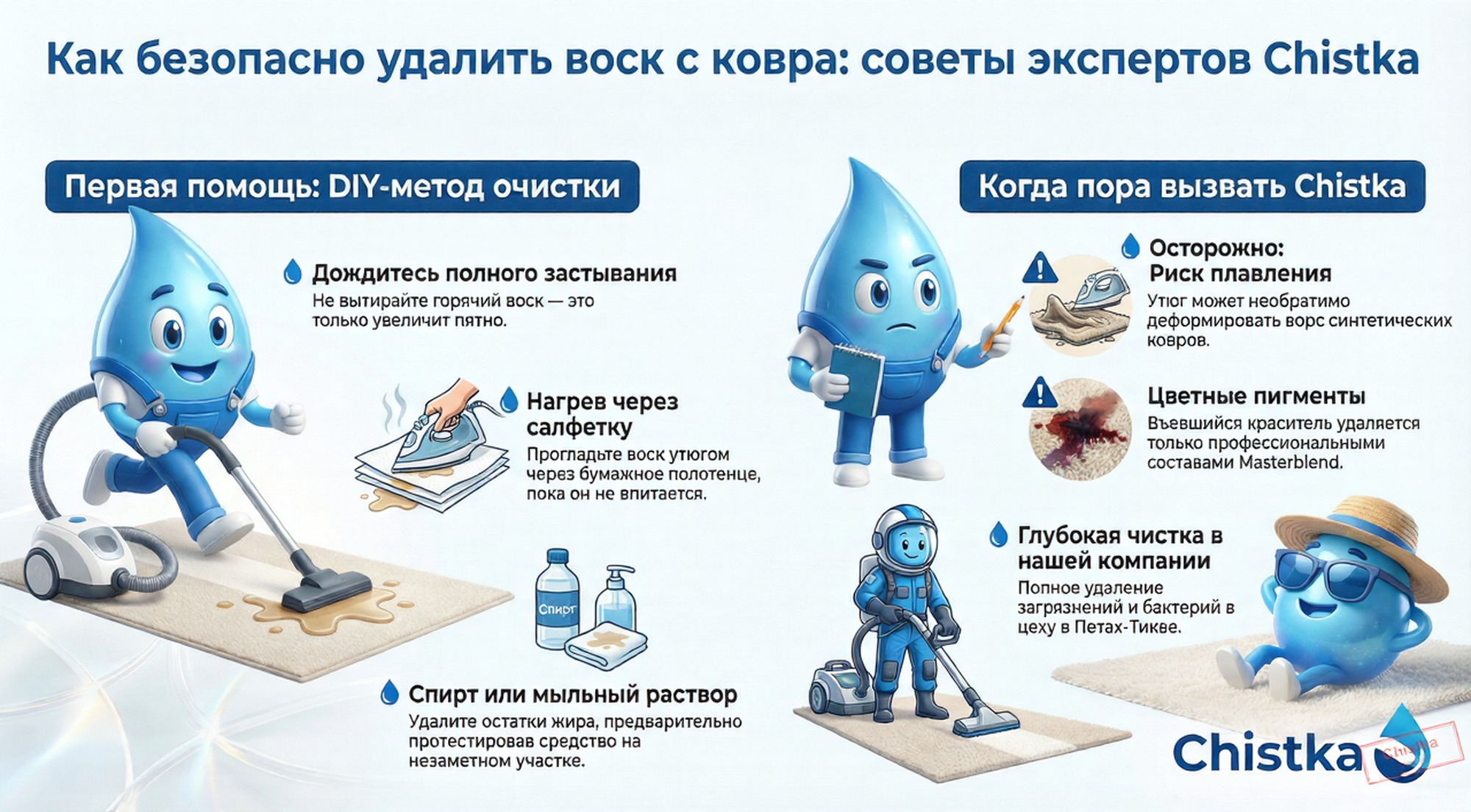 Если самостоятельно удалить воск с ковра не удалось или вы боитесь повредить покрытие, обратитесь к нашим специалистам. Компания «Чистка» выполняет профессиональную химчистку ковров на дому и на фабрике в Петах‑Тикве и обслуживает клиентов из центральных районов Израиля.