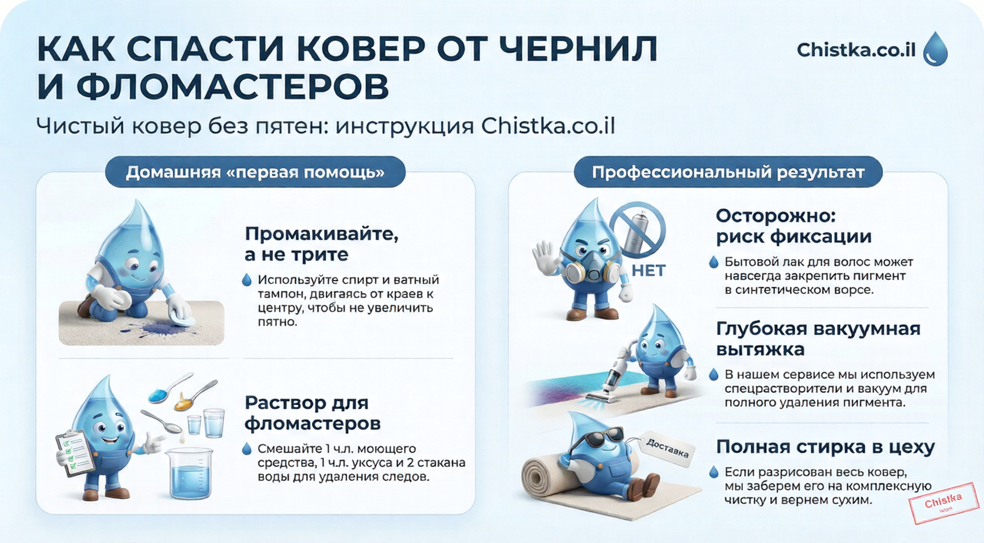 Если вы боитесь повредить ковёр или домашние способы не помогли, вы можете обратиться к нашим специалистам. Компания «Чистка» выполняет профессиональную химчистку ковров на дому и на фабрике в Петах‑Тикве и обслуживает клиентов из центральных районов Израиля.