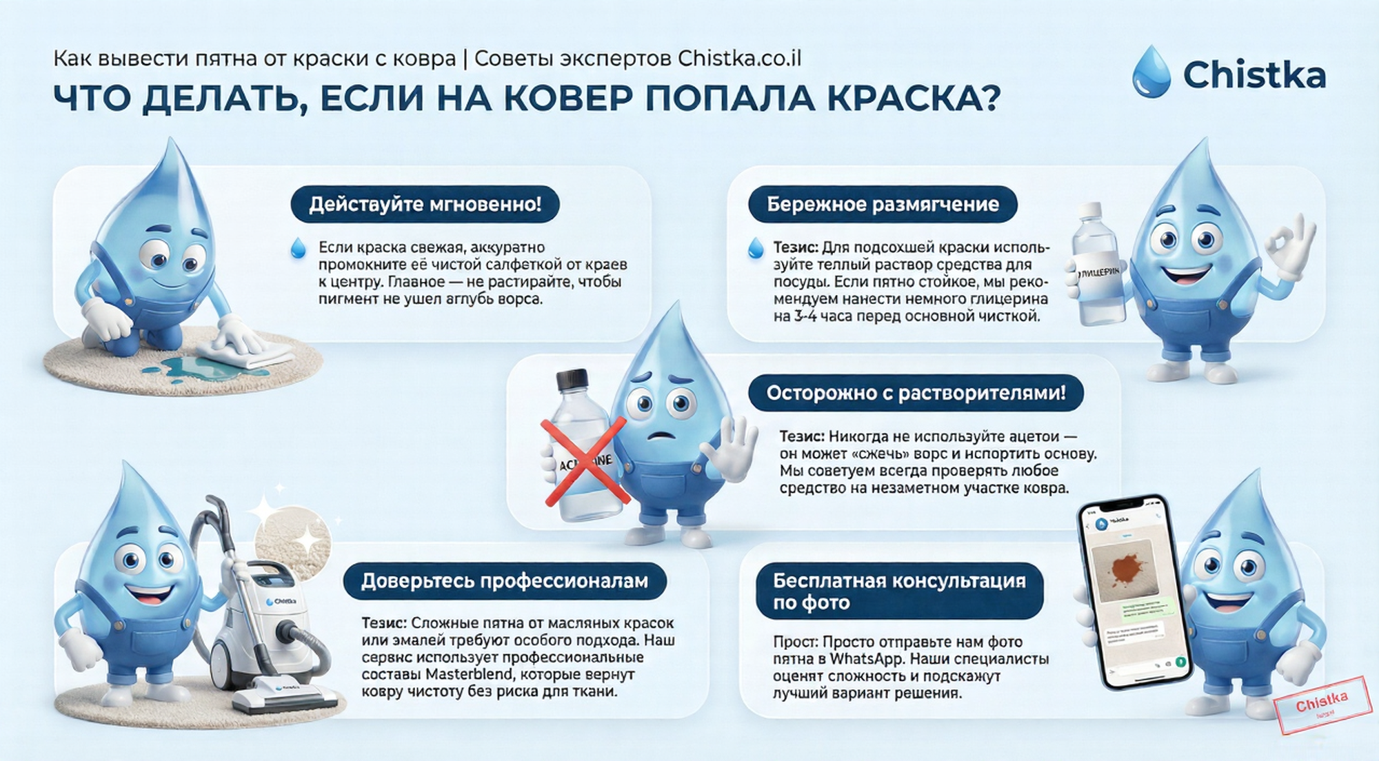 Если после самостоятельной чистки пятно от краски всё равно заметно или вы не хотите рисковать ковром, вы можете заказать профессиональную химчистку ковра. Компания «Чистка» очищает ковры на фабрике в Петах‑Тикве и обслуживает клиентов из центральных районов Израиля.