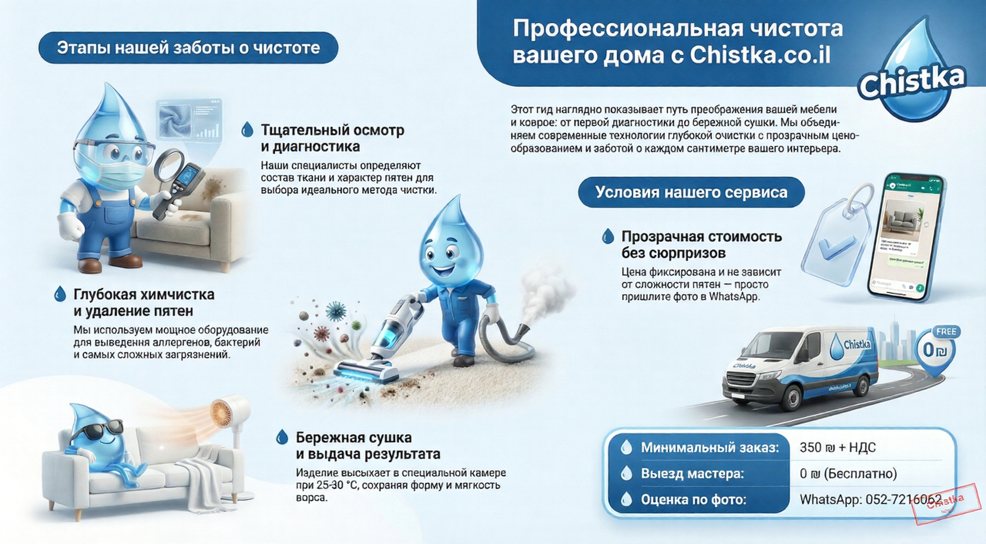 Стоимость химчистки зависит от типа изделия, его размеров и степени загрязнения, поэтому мы фиксируем на сайте базовые расценки и минимальный заказ 350 шекелей плюс НДС. Точную сумму мы называем после уточнения деталей или по фото изделия, отправленному в WhatsApp.