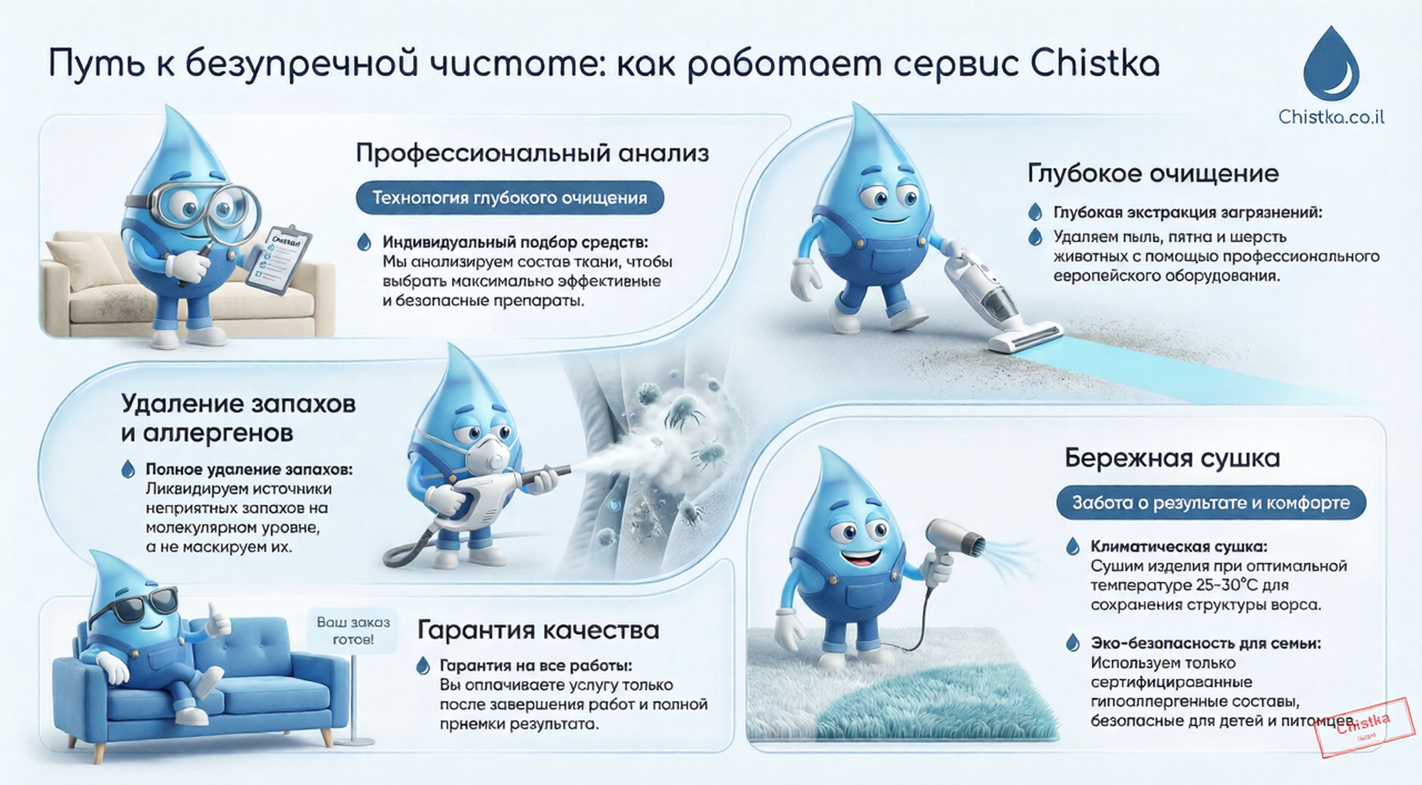 Компания «Chistka.co.il» предоставляет полный комплекс услуг по профессиональной химчистке ковров, диванов, матрасов, ковролина и мягкой мебели в Израиле. Мы работаем с частными и корпоративными клиентами, выполняем чистку на дому, в офисах и с вывозом ковров на фабрику в Петах-Тикве. Наша задача — удалить пятна, запахи и глубокие загрязнения, восстановить внешний вид изделий и обеспечить безопасную среду для вашей семьи и сотрудников.
